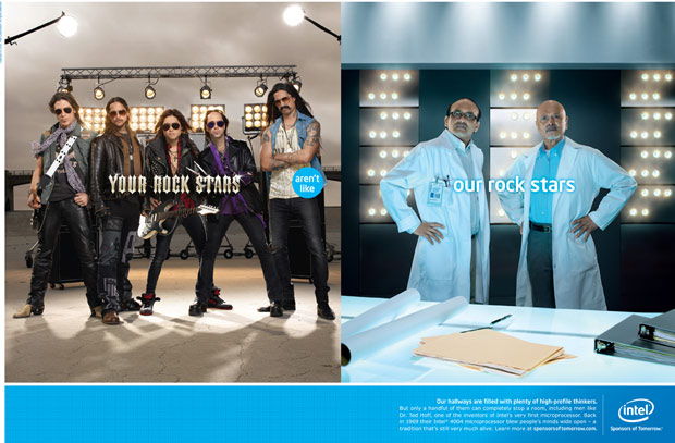 There is a great series of print ads by Intel, the computer chip giant, which shows contrasting images.  In one side by side contrast, college aged kids are depicted in some kind of aerobic class and on the other side, it shows an image of two similar aged kids sitting over a chessboard in a cafeteria.  The caption is, “Your workout” and then “Our workout”.  As the image on the top of this piece shows, another juxtaposition is “your rockstars, our rockstars”.