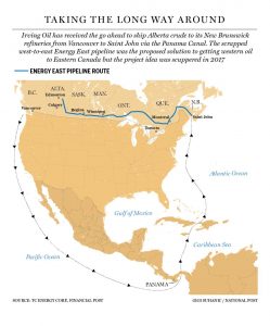 Not the direct, as the crow flies route across the country, but by tankers through different nations and two oceans, risking all kinds of catastrophe on the high seas in order to placate the environmental and economic interests of Ontario and Quebec who disallow any pipeline through their provinces. Only virtue signalling nutters can think that this route of transport could be less harmful than to run a pipeline across the country by land.